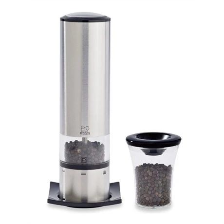 Petite merveille technologique, ce coffret moulin à poivre électrique Elis Sense de Peugeot se déclenche d’une simple touche tactile simultanée sur le corps et le bouton. L’éclairage LED du moulin permet ensuite de contrôler avec précision le dosage obtenu sur mesure grâce au système de réglage de mouture U’Select. Ce système est composé de 6 moutures différentes pour le poivre (et 3 pour le sel). Grâce à la fiole garnie à usage d’entonnoir doseur et à la coupelle qui l’accompagnent, le remplissage et le service sont impeccables. Il est en inox et polycarbonate. Il fonctionne avec 6 piles AAA fournies.