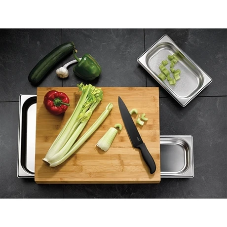 Vous découpez les fruits, les légumes, la viande sans faire de va-et-vient jusqu’à la poubelle, les 3 inserts récoltent les aliments découpés et collectent les déchets pour des préparations culinaires plus facilement réalisées. Les inserts sont en acier inoxydable 18/10 idéal pour le contact alimentaire, ce matériau très qualitatif leurs confère une grande résistance. Faciles d’utilisation, ils se glissent simplement, comme des tiroirs sous de la planche. Polyvalents, ils peuvent servir de récipients pour conserver, paner ou comme plats allant au four et bien sûr ils passent au lave-vaisselle. La planche à découper en bambou 46 cm Kenina 3 inserts acier inoxydable requiert un entretien régulier pour limiter le risque de bactéries ; le passage au lave-vaisselle de la planche en bambou est déconseillé, il convient donc de la laver à l’eau chaude et au produit vaisselle et de la sécher ensuite à l’air libre ou à l’aide d’un chiffon propre. La sécurité et la stabilité sont garanties par des pieds en caoutchouc, situés sur la face inférieure de la planche à découper. Belle et ultra pratique, elle va faire des envieux.