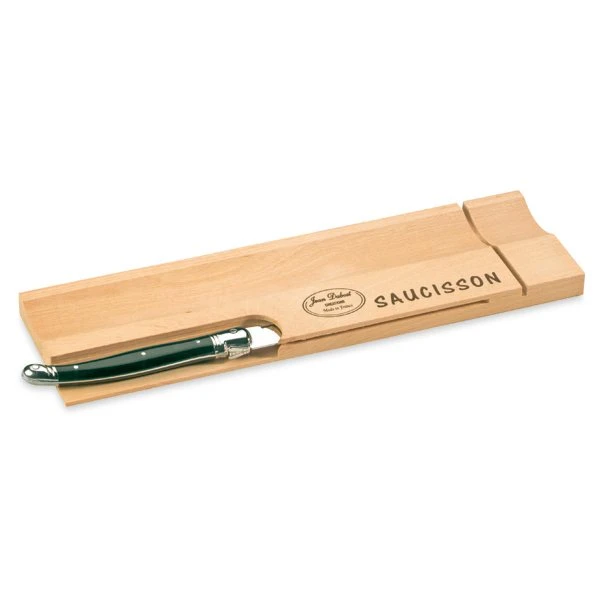 Pratique, la planche et couteau à saucisson Laguiole Jean Dubost reste toujours à portée de main pour couper saucisson, saucisse sèche ou chorizo. Elle est dotée d’une fente latérale servant de repère pour couper des tranches régulières. Incurvée, elle maintient le saucisson en place. La découpe se fait en toute sécurité. Un espace de rangement intégré dans la planche permet de ranger le couteau. La lame est parfaitement préservée. La planche est en bois naturel. La lame micro dentée du couteau est en inox épaisseur 1,2 mm. Son manche est en ABS. Le couteau se nettoie au lave-vaisselle. Fabrication française, à Thiers.