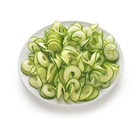 – La lame à découper ou à trancher avec base de 1,2 cm crée des rubans parfaits pour les fruits et légumes frais sans trognons, comme les courgettes ou les patates douces